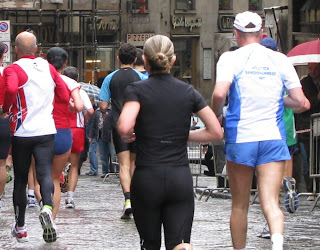 Quanta gente!! Mi infilo tra le persone cercando di avvicinarmi ai pace-maker dell'ora e quaranta ma sono davvero troppo avanti così desisto miseramente. (mi dico, vabè 500 metri e mi aggancio...le ultime parole famose!!!)